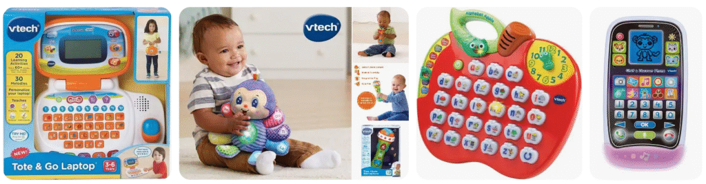 VTech’s product line spans a wide age range—from infants and toddlers to school-aged kids. Their toys are often interactive and packed with features designed to promote learning in areas like language development, basic math, music, and problem-solving.